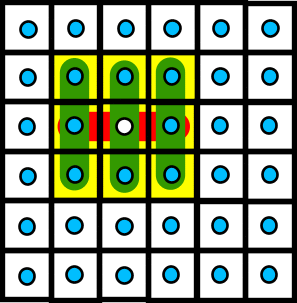 These two diagrams are intended to indicate two arrays of Wolfram neighbourhood automata. The 1D automata run through the two-dimensional grid of cells horizontally on the left and vertically on the right. If a composite automata is formed from the application of these two configurations on alternate timesteps, the result is a Moore neighbourhood automaton: