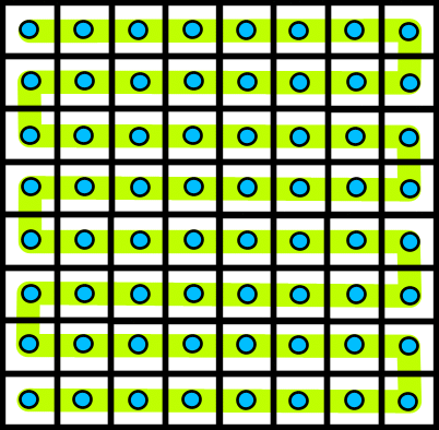 Invertible Moore automataInvertible Moore automataThe construction yielding a Moore neighbourhood automaton is essentially the same as the one for the Honeycomb neighbourhood.This page essentially only reproduces the diagrams relevant to the Moore neighbourhood. Please refer to the Honeycomb contruction method for additional details. First a path is constructed through the automata, passing through every cell.