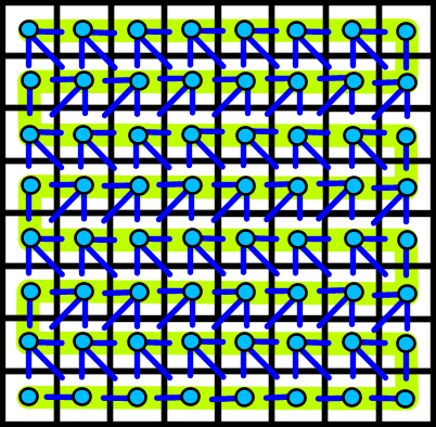 ![]() Blue lines from a cell connect it to up to two neighbours. Next, an update function which is applied on "odd" timesteps is allocated to each cell. As before, this function is such that the state of each cell depends only on it's previous state, and the state of up to three of its neighbours in the previous generation. This time, the three neighbours are chosen in such a way that they are closer to the end of the path in the top left-hand corner (again, with distance being measured along the path). The following diagram shows this situation: