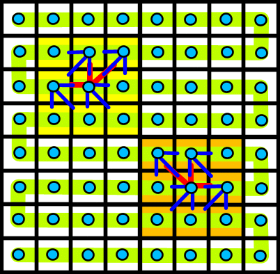 ![]() If you now consider the effect of applying both updates simultaneously, you will see that the resulting composite automata uses the Moore neighbourhood. A diagram should help visualise what is happening: