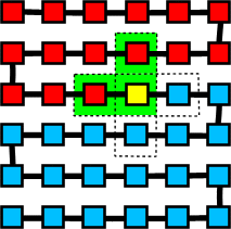 ![]() In this diagram, the yellow cell is the current cell. The red cells are nearer the starting cell. The dotted lines indicate the VN-neighbourhood. The green colour indicates the cells which may contribute to the update function of the yellow cell. The update function may be any boolean function, with one restriction: no matter what the states of the "red" cells are, the yellow cell must have the "final say" - and should always be able to completely influence the state of the cell in the next generation. In practice, this menas that the yellow cell should be Exclusive OR'd with the function contributed by the red cells. As Exclusive OR is a linear function, this has sometimes resulted in this type of automata being referred to as "quasi-linear".