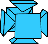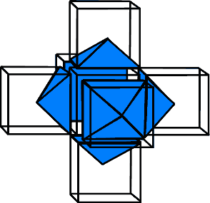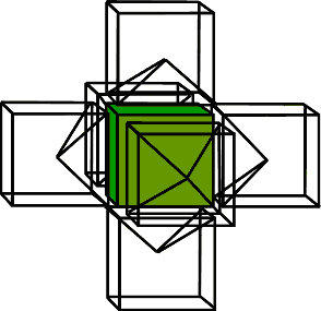 This neighbourhood is a sort of cross between the 3D von Neumann neighbourhood and the isomentric von Neumann neighbourhood. In this neighbourhood, each cubic cell is divided into six square-based pyramids, something like this: